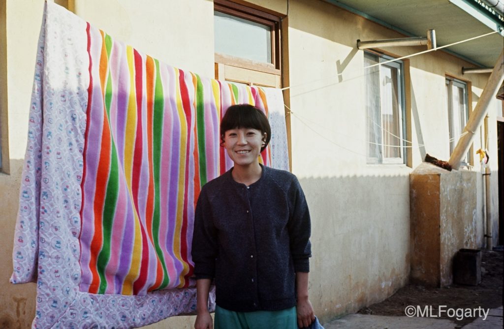 Yo Sun-cha  standing in front of one of the beautiful quilts ubiquitous in Korea.
