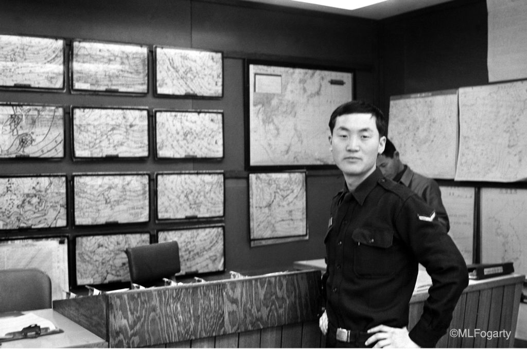 My closest Korean friend Lee Hak-chae in the weather station at Kunsan AFB where we worked. A really fine man, we exchanged gifts when I left Korea. He gave me a Korean flag and I gave him a Webster's dictionary.